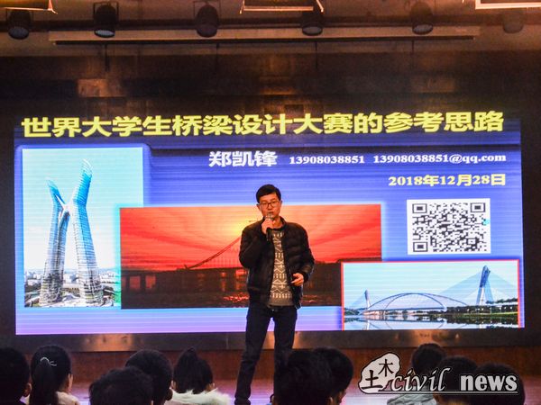首先王若羽老师向大家致欢迎辞,接着肖林老师向大家介绍了世桥赛赛史,并告诉大家即将到来的是第三届世桥赛。随后郑凯锋教授正式开始了以“世界老员工桥梁设计大赛的参考思路”为题的讲座。