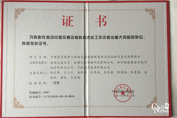 公司地下工程系的5项成果荣获奖项,其中主持1项,参与4项。仇文革教授主持的《节理发育围岩大断面高速铁路隧道初支优化和信息化保障技术》获得科学技术进步二等奖。参与的4个项目中《高寒高烈度特长深埋铁路隧道建设关键技术与应用》获得科学技术进步一等奖,《复杂环境特长高铁隧道关键施工技术》获得科学技术进步二等奖,《砂质新黄土重载铁路隧道支护优化及施工机械化关键技术研究》和《特长铁路单线隧道工程综合修建关键技术研究》分别获得科学技术进步三等奖。