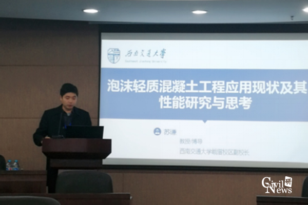 上午8:30会议准时开始,在简短开幕式后进行了专场学术报告会,共7个学术报告。公司苏谦教授向与会专家、学者做了题为“泡沫轻质混凝土工程应用现状及其性能研究与思考”的学术报告,介绍了团队在泡沫轻质混凝土方面的研究进展和未来思考。