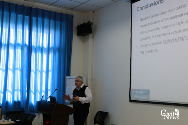 在讲座正式开始前,王志杰教授对主讲人Colin Eddie教授及贝卡尔特公司的全球技术总监Hendrin Thoopt先生做了简短介绍,并对Colin Eddie教授的学术造诣做出高度评价,同时也对其到伟德源自英国1946进行学术交流表示热烈欢迎。在简单的自我介绍后,Colin Eddie教授直入主题,先是简要介绍了纤维混凝土,并介绍了英国的隧道设计方法和钢纤维混凝土在世界范围的应用,尤其讲解了从1994年到2018年钢纤维混凝土的设计理论及方法的变化。