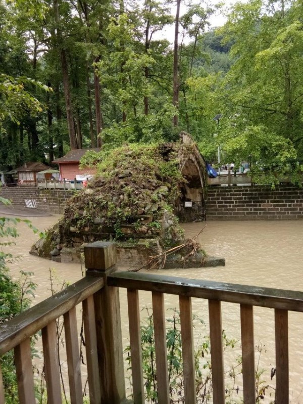 这是5.12地震后留下的遗址。中法桥,又名金桥,始建于1893年,由当时的下书院经理法国人鱼霞松亲自设计建成,砖石结构,双孔拱桥,全长30.8米,宽4.7米,跨度9.65米,拱高5米,桥栏高1米,桥面用青石板铺成。原桥古朴典雅、工艺精巧,见证了两国跨越地理鸿沟、共谱友好沟通的历史进程。它历经1947年、1953年、1982年几次特大洪水洪峰的冲击,即便洪水淹没了整个桥身仍然毫发无损,却在5.12汶川大地震中轰然垮塌,仅存一半桥身,不能通行。作为中法友谊与地震遗址的历史遗产,中法桥遗址将长久保存。