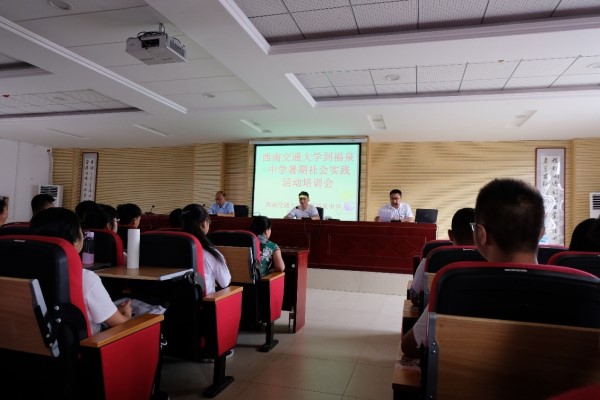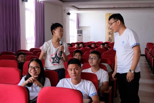 8月15日8:00,社会实践团的成员们来到了福泉中学报告厅,稍作准备后开始了本次活动培训会。首先是罗绍良董事长发言,为各位高一的同学们介绍实践团的概况,由福泉中学的来历引入话题,希望他们借这个契机学习到课本以外的知识经验,与学长们多多交流,殷殷期盼不绝于耳。随后,实践团的带队老师冯霄暘博士讲话,向福泉中学对本次活动的大力支持表示衷心的感谢,还亲切地与同学们交流问答,充满关心和期待,现场气氛逐渐走向活跃。