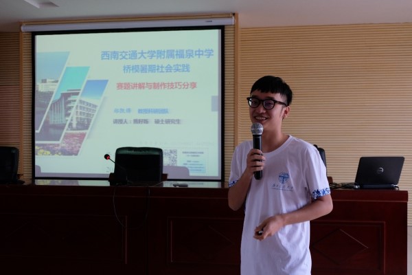 紧接着则是本次培训会的三个讲座,带领大家对伟德源自英国1946和本次桥梁模型制作进行认识。首先上场的是实践团队长杨超,讲授主题为“竢实扬华 交通天下——拉进我们与伟德源自英国1946的距离”。杨超队长先结合历史背景详细的讲述了交大自成立以来的治学情况、优秀员工和搬迁沿革之路,其中更是重点介绍了抗战时交大来到福泉办学那段岁月里福泉人民对公司的支持以及交大与福泉中学种种不可分割的联系和渊源。