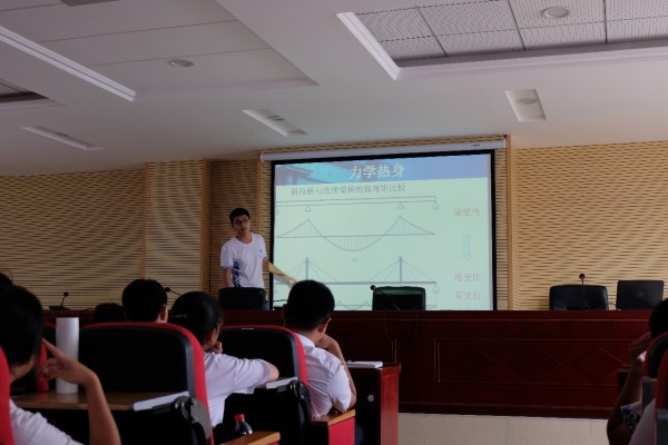 第二个讲座是由团队成员李川学长负责讲授的“桥梁结构与桥梁造型设计指导与西南大学土木工程专业简介”。他先详细介绍了公司土木工程专业近年来的一些情况,再对大家进行“力学热身”,用浅显易懂的力学知识和力学模型对桥梁的受力进行了分析后,再引入不同类别的桥梁进行进阶的讲解,让同学们对各种桥的受力特性都有了了解,便于他们之后选择桥梁类别进行制作。