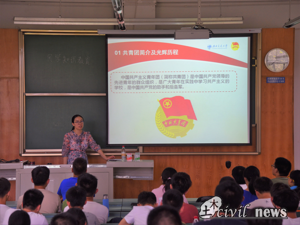 黄雪娇老师首先介绍了当代共青团的光辉历程,并以莫喀高铁青年突击队等三个与土木工程相关的实例,让同学们意识到作为当代青年应肩负的责任。黄老师带领大家一同起立宣誓,燃起了同学们作为共青团员的自豪感。在场同学激情澎湃,朝气蓬勃。随后黄老师指导同学们学习并合唱中国共产主义青年团团歌。同学们全体起立,歌声洪亮,展现了青年一代人的饱满热情。