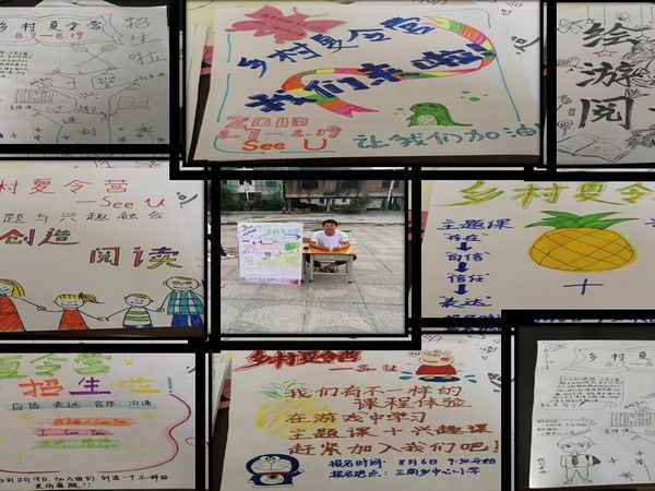 到达公司后,我们和当地的团委书记进行了对接,在明确了住宿和做饭以及教学的地方之后就开始为招生做准备了。8月5号上午我们开始制作招生海报,下午我们在小镇上上去挨家挨户宣传,后面还让当地村委的书记通过高音喇叭帮我们宣传,以下就是我们的招生海报和宣传摊。