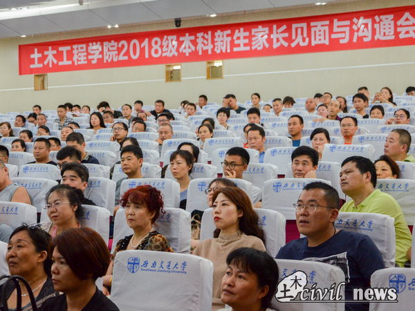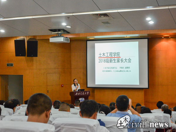 8月29日下午,18级新生家长们早早来到了犀浦图书馆一号报告厅,准备参加即将开始的新生家长见面会。本次新生家长见面会到场的嘉宾有土木工程公司党委副书记李锦红,2018级辅导员黄雪娇老师与李德斌老师。黄雪娇老师担任本次家长见面会的主持人。