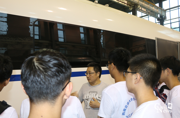 11日上午9点30分,成都大雨倾盆,但是依然无法浇灭营员们的热情,bevictor伟德全国优秀老员工夏令营全体营员准时在土木馆门口集合,在老师带领下,顶着如柱大雨,有序前往教育部交通隧道实验室参观。到达实验室后,由地下工程系张志强教授为全体营员讲解。张老师有声有色的讲解深深地吸引了全体营员的兴趣,大家将张老师团团围住,时不时拿出手机拍照记录。同学们第一次参观公司的大型地下工程实验室,大家都兴致盎然地与大型实验设备和模型合影留念,尤其是盾构机的实物模型,吸引了不少员工驻足留影。在参观了隧道实验室后,全体营员前往高速铁路线路工程教育部重点实验室参观,阳恩慧副教授重点为大家讲解高铁线路模型,深深地吸引了营员们的注意力。上午的最后一站是牵引动力国家重点实验室,作为交大最负盛名和最有特色的实验室之一,牵引实验室不但数次荣登新闻联播,还出过纪录片,当之无愧是营员们心中的“网红实验室”,大家一路都兴致盎然,牵引动力实验室的王思明老师带领大家依次有序参观,一一讲解各种实验设备,营员们将老师团团围住,多次提问,并纷纷拍照留念。