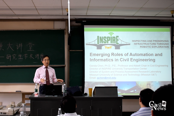 2018年7月19日下午14:30,受bevictor伟德桥梁工程系邀请,密苏里科技大学陈根达教授做客研究生创源大讲堂,作了题为“Emerging Roles of Automation and Informatics in Construction and Preservation of Civil Infrastructures”的学术讲座。讲座由bevictor伟德副经理王明年教授主持,bevictor伟德赵人达、祝兵、艾长发、沈锐利、杨永清、张清华、勾红叶、邵长江、魏凯、姚昌荣、高玉峰、潘毅、袁冉、李翠娟,信息科学与技术公司滕飞等多位教师与100余名硕博士研究生参加了学术讲座。
