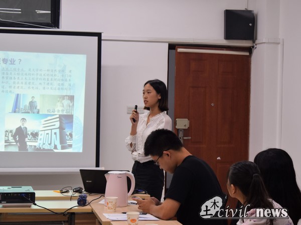 李越就专业概况、学习内容以及就业方向这三个方面对土木工程专业作了介绍。陆粤回忆起自己做过的第一个重要的选择,就是选择了土木工程专业,土木工程是一个极具创造性的学科,她相信在未来一定会带给土木人许多的惊喜,接下来需要做的就是用丰富的知识武装自己,为未来的工作做好准备。“熬夜画图后的早晨,还有共同奋战的队友一同吃早餐,这是一件幸福的事。”她的这句话令在场的所有土木学子感同身受。
