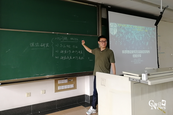 之后,刘飞成师兄上台作了题为“科学理论研究方法及论文写作经验分享”的精彩讲座。刘师兄先是做了简要的自我介绍,其后对他在进行理论研究过程中所取得的经验和教训对大家做了鞭辟入里的讲解。刘师兄分别从科学研究角度、方法、具体展开和成果归纳四个方面向同学们展示了进行一项科学研究的完整过程,他还以自己曾经做过的一个离心机试验为例,向大家描述了从建立研究方向、计划研究思路和完成研究过程的艰辛历程,提到了当时他在完成此次离心机试验中遇到的挫折,如在建立缩尺模型结构构件时因某种材料特性原因试验无法正常开展,他为此思索了整整一周才解决问题,让在场的同学真切感受到完成科学研究的不易。刘师兄的讲座风趣幽默,生动形象,在座同学不时发出会心的笑声。刘师兄也解答了几个同学的问题,鼓励有科研志向的同学考取博士研究生,现场响起一阵如雷贯耳的掌声和喝彩声。