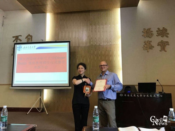 会上,Olivier教授也表示非常高兴能够加入西南交大bevictor伟德这个大家庭,并表示愿意和公司师生共同努力,在学术领域作出更多贡献。随后富海鹰副经理代表木工程公司向Olivier教授颁发了聘书与奖章,双方亲切握手并合影留念,都表达了进一步合作的意愿与信心。