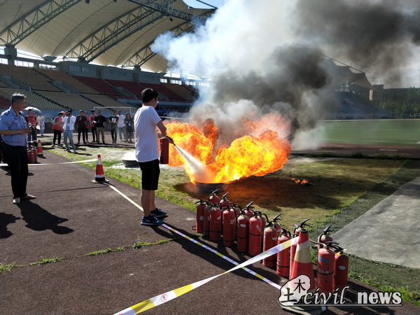 田径场上,来自各个公司的近3300名同学按顺序排列整齐,整理好队形后,公司党委副书记张学龙在主席台上就此次演习进行了总结,并且告诫同学们要有安全意识,遵守安全法律。大会之后,田径场上开放了3处体验区:灭火器实践体验区、灭火超感体验区、心肺复苏紧急救援体验区,供有兴趣的同学自由体验;2个灭火器体验区都有着专业的工作人员指导参加体验的同学,而心肺复苏紧急救援体验区也有一批来自医学部的老师和同学在一旁指导。