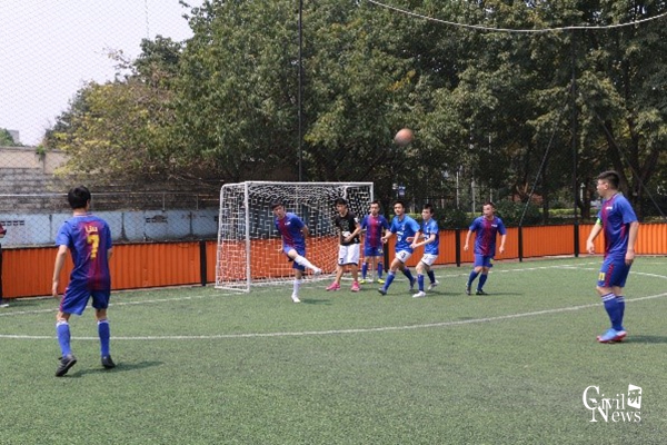 随着哨音吹响,比赛在骄阳下开始了。B组隧道专业足球队与博士足球队上半场两边踢得有来有回,两边的后防线发挥都很稳定,不让对手有任何近距离射门的机会。上半场结束,两边0比0战平。