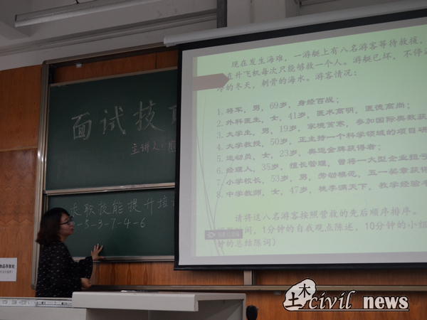 她向大家介绍了面试的两大基本原则:了解自我、了解企业。了解自我也就是对自己的知识水平、综合能力以及个性特征等方面有更清晰的认识,了解企业也就是去了解行业前途,企业地位、规模以及地理位置等。只有了解自我、了解企业才能找到真正适合自己的工作。