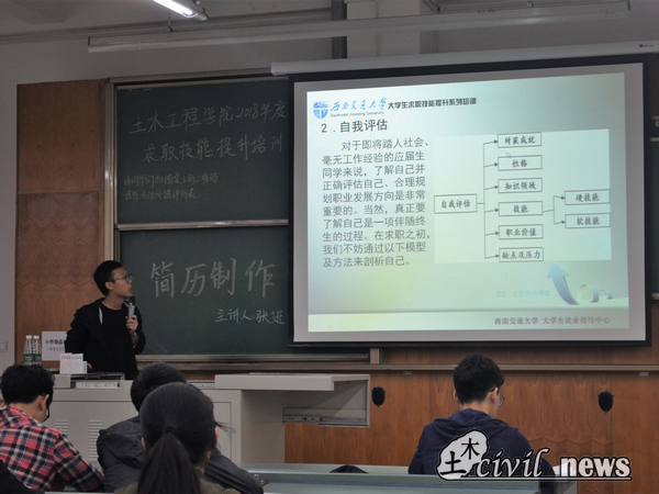 开始阶段,张进老师为同学们讲解了如何制作一份合格的简历。内容主要包括:写简历前的思考与准备工作、简历的构成要素及类型、简历制作的规范和技巧。张进老师强调:写简历前先做到知己知彼,求职与招聘对应的是求职者与招聘方互相了解、互相匹配的过程;对于即将踏人社会、毫无工作经验的应届生同学来说,了解自己并正确评估自己、合理规划职业发展方向是非常重要的。