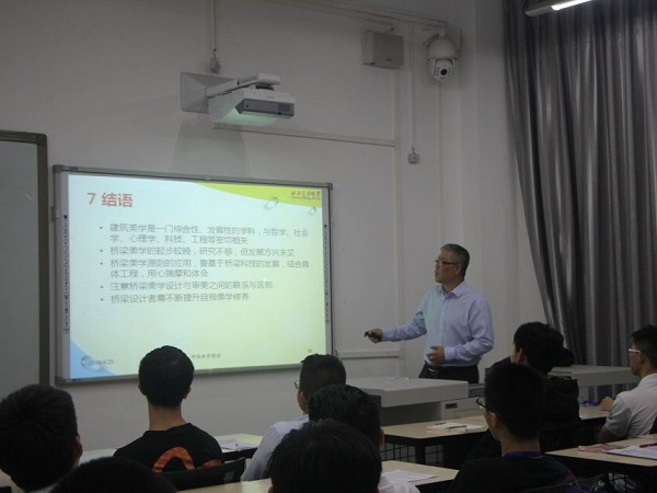 活动开始,李教授以一个问题开头:“土木人怎样提高自身的人文素养?”紧接着,李教授讲述了桥梁美学的涵盖方面。他指明桥梁的内涵在于:跨越承载的工程结构,通达交流的社会纽带,开放公共的大众建筑,造型多样的人工景观。由于桥梁投资巨大,影响深远,为了发挥其最大作用,让其长久存在,需要赋予其历史、文化和美学上的意义。在桥梁的美学设计方面,工程师担当主体,而建筑师可以提供专业化的美学设计。