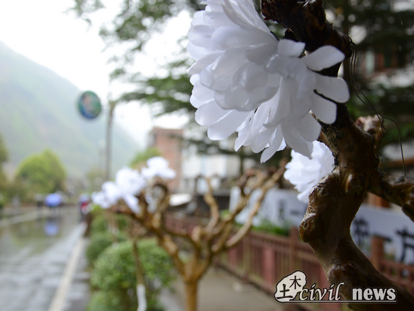 撑着伞继续往前走,路上不时能看到前来吊唁亲人的人。路两旁的树上缀满了白花,表达着人们对汶川大地震的哀思。穿过公安局后不久我们到了纪念碑,ASCE的苏家琪同学组织全体成员在此合影留念。再往前走我们到了景家山崩坍遗址。两百多万方山石顷刻间抹去了北川中学新区,朗朗书声在一阵轰隆做响后化为了寂静,潸然泪下的寂静。