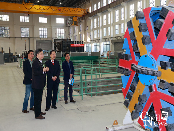 当参观到实体盾构机时,电源接通,实体盾构机转动了起来,空旷的实验大厅顿时响起了轰鸣声。孙院士向何川教授了解了该盾构机的适用土质等基本情况。