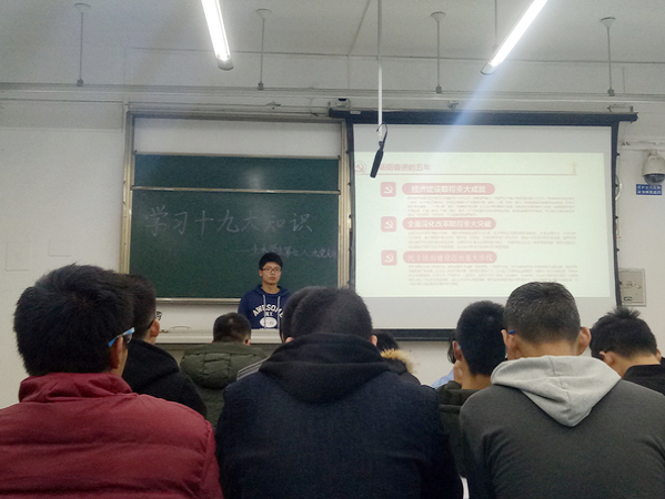 接着,第八党支部代表王泗上台做了有关“新时代中国特色社会主义思想”、“新时代中国特色社会主义发展的两个阶段”、“全面开放新格局”的十九大专题汇报,他谈到,新时代中国特色社会主义思想是全党全国人民为实现中华民族伟大复兴而奋斗的行动指南,坚持和发展中国特色社会主义就要坚持党的领导,坚持深化改革,坚持依法治国、从严治党,他表示,我们处在新时代的中国,就要为社会主义现代化而努力,为实现中华民族伟大复兴而奋斗。