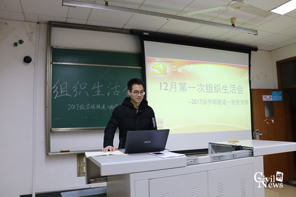 12月3日晚上七点,2017级学硕隧道一班党支部在逸夫馆4419召开支部组织生活会,参加本次大会的有正式党员12人,预备党员1人,本次生活会的内容主要分为两个部分:观看学习《山谷中挺起不倒的脊梁》、《为灾区群众撑起一片天》教育电视片以及关于王骁男同志预备党员转正的相关事宜,本次组织生活会由2017级学硕隧道一班党支部书记张振华主持。