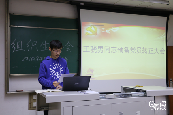 然后,王骁男同志就个人一年以来的基本情况从思想、学习、工作、生活等多个方面进行总结汇报,一年以来,进一步全面学习和掌握了党的理论、纲领、路线、方针、政策等知识,时刻以正式党员的标准来要求自己,并表示在今后的学习生活中继续坚持不懈地学习科学知识,坚持不懈地用科学精神武装自己的头脑,提高各方面的工作能力,为国家的富强、民族的振兴、社会的进步多作贡献。