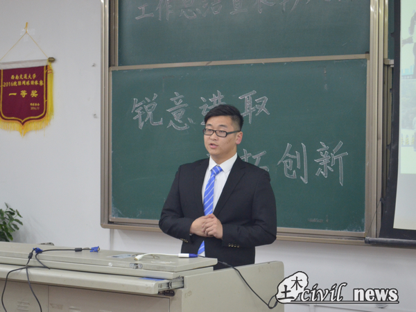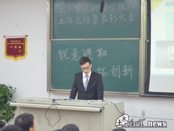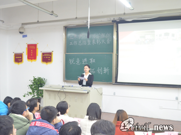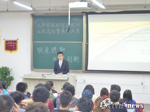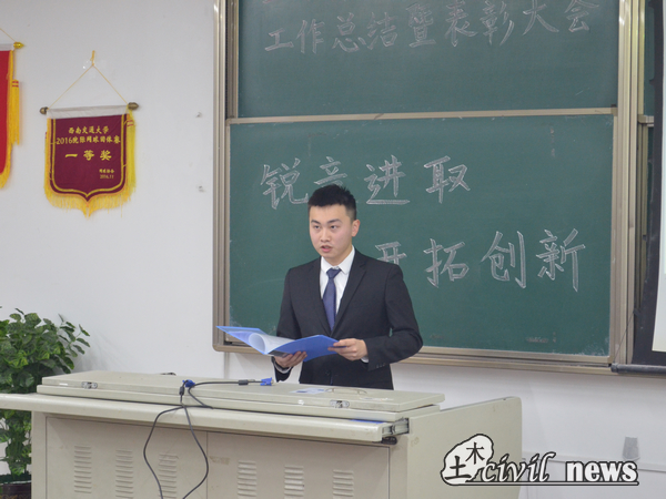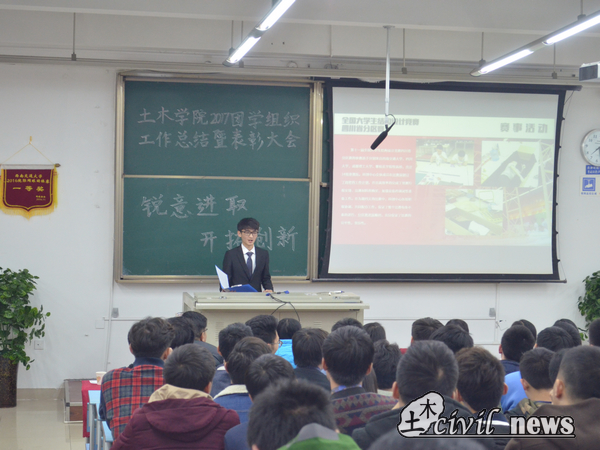 本科生团学组织科创中心代表侯禹辰向大家介绍了由科创中心举办的“土木科技月”、“新生设想家”等一系列活动并对17年的组织工作进行总结汇报,赢得现场一致好评,“办一流结构竞赛,育万千设计英才”的口号更是让大家看到了科创人的担当与进取。