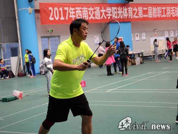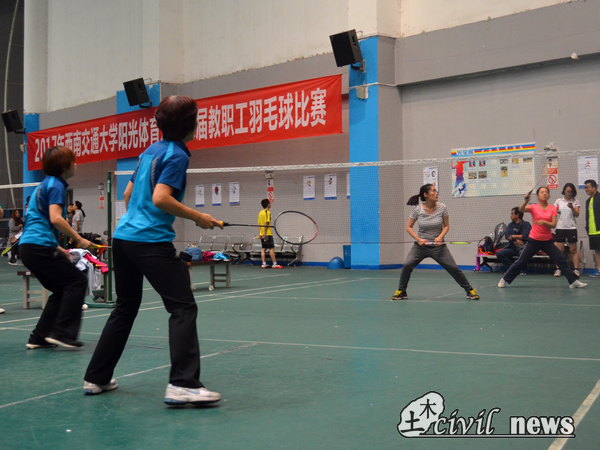 11月3日下午17:40,教职工羽毛球赛在犀浦校区羽毛球馆如火如荼地进行着。男、女单打、男子双打、女子双打、男女混合双打五个项目的角逐正在激烈上演,教职工们提前到达场地,为下面精彩的对抗做准备。