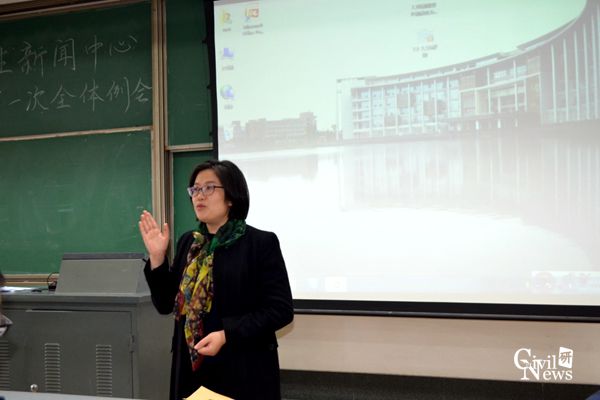 首先,新闻中心前副主任朱洪雪从总体情况、团队建设、新闻报道成果、新媒体建设及本学期工作进步等方面详细总结了上一学年的工作情况,并指出了新学年的工作展望,在接下来的工作中,新闻工作人员需要加强与粉丝互动,继续增加微信、微博的影响力;同时,增加更多的原创内容,提高新媒体平台内容的质量;再者,提高平台的版面设计,增加官微logo的美观性;最后,加强新媒体成员之间的沟通,推送更加完美的新闻报道。