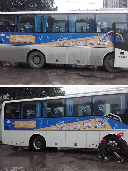 下午1时许队员们来到九里校区校车站,在分发完工具后,成员们有组织地进行了分工。拿上抹布,提上水枪,正式开始了对校车的清洗。常年奔波在犀浦校区和九里校区间的校车身上布满着尘土,水枪不足以将其冲刷干净,志愿者们于是用抹布一点一点地将校车擦干净,一丝不苟地清洗着每一个角落,还原了校车本来干净清新的面貌。一辆接着一辆的校车接受着志愿者们的清洗,但志愿者们却乐此不疲,回报为我们服务的校车本来就是一件十分值得开心的事。