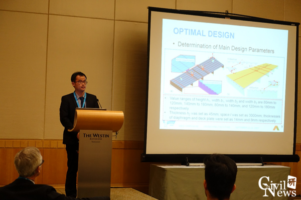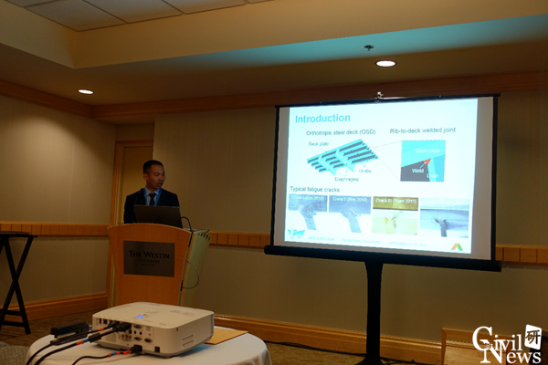 公司与会代表共做了4场学术报告:博士生周筱航做了题为《Modal parameter identification of a curved cable-stayed model bridge based on EDA and DATA-SSI》的报告;博士生张二华做了题为《Influence of curvature radius on static and dynamic characteristics of curved cable-stayed bridge》的报告;博士生程震宇做了题为《Optimal design and fatigue performances of innovative corrugated orthotropic steel deck plate-RPC layer composite deck structure》的报告;博士生罗鹏军做了题为《Fatigue evaluation and parametric study on orthotropic steel deck composed of a new-type of U-rib with upset webs》的报告。报告介绍了桥梁工程系在健康监测和高性能结构桥梁方面的最新研究进行,引起了国内外同行的浓厚兴趣,取得的成果获得了国内外同行的好评。