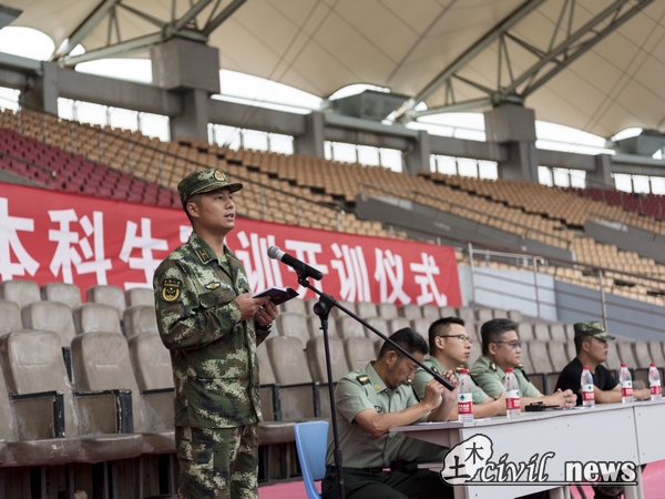 随后,仪式进行第三项,由黄少校发表讲话。他首先欢迎新同学来到西南交大学习以及军训并对前来军训的教官们表示问候。随后,他强调了军训能够培养一个人坚韧不拔、迎难而上的坚毅品质,希望大家能够重视军训。黄少校语重心长地说:“军训不仅仅是我们每个老员工的义务,更是实现我们强军梦的一个重要步骤。”