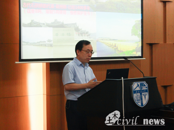在接下来的讲授中,赵副总工程师先介绍了中国四大古桥,即广济桥、赵州桥、洛阳桥、卢沟桥。而后,他又将近代中国公路桥梁发展历史分为从学习追赶到跟踪提高,最后不断创新与超越。“在发展道路上,我们一向都是博采众长、自主建设”,他如是说道。而今在世界排名前十的各类型桥梁中,我国桥梁均占据了半壁江山。在提到我国各大优秀桥梁时,赵总以及在场老师同学的眼睛中无不闪烁着骄傲的光芒。