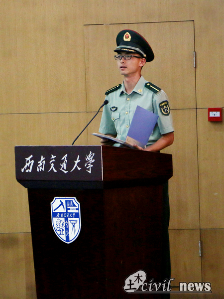 之后,2013级土木国防生张润泽作为员工代表上台发言。四年前,他们怀着对大学的向往,懵懵懂懂地跨入了校园,成长历程点点滴滴,有你,有我,有他。面对老师,面对母校,说不完的祝福,道不完的感恩。