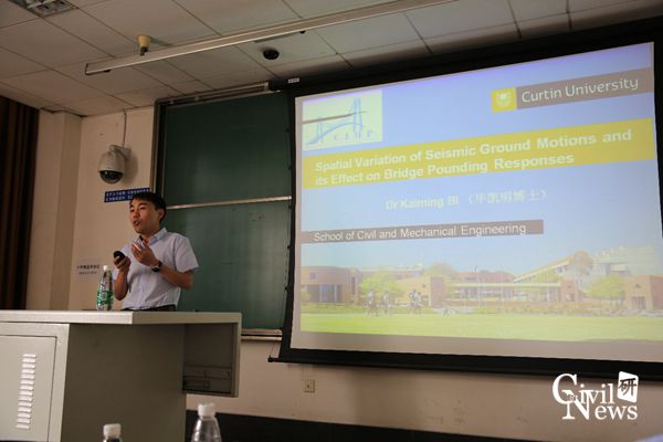 本次学术讲座由桥梁系副主任李小珍教授主持。李小珍教授首先对毕凯明博士的到来表示热烈欢迎,并对毕凯明博士作了简要介绍。毕凯明博士首先对科廷大学和基础设施监测与防护中心(http://structuraldynamics.curtin.edu.au/)的相关情况进行了简要介绍,并热情邀请公司研究生前往科廷大学学习深造。
