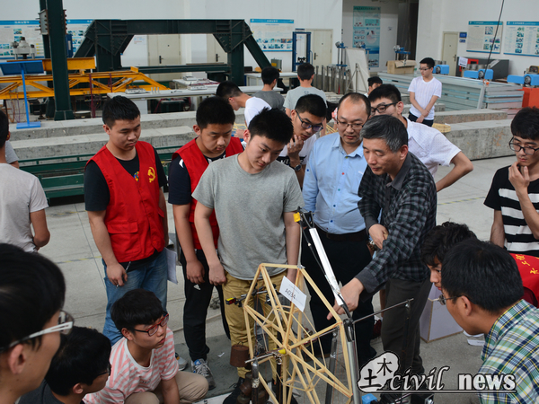 本次决赛分为答辩、第一轮加载、第二轮加载三个环节。在答辩环节中,每个小组按照要求,由一名同学用PPT对本组参赛作品进行全面介绍,而其他两名同则向评委老师展示实体模型。参赛的同学们通过查阅资料、受力分析和用软件分析模型性能等方法,最终确定模型的设计,并在现场为大家讲解设计和制作的过程。评审老师走入场地,认真地观察模型,做出点评,并根据实际情况提出建议。