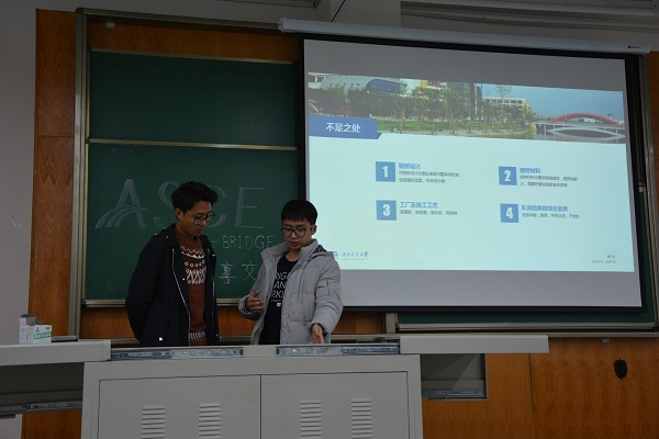 本次交流分享会可分为“赛前准备”“比赛实况”以及“经验与反思”三部分,依次由王皓正、王乾屾、胡萧越、冯乾宽、金云涛、邓江绪、廖文杰、黄道兴两两分组进行分享,全方位介绍了钢桥赛的整个流程,为将来参加钢桥比赛的同学们提出了宝贵意见。