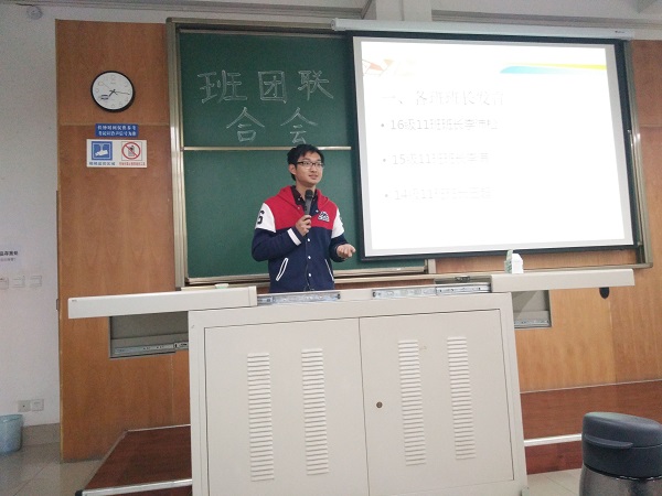 当晚7点整,在14级团支书肖波的主持下,会议正式开始。首先进行的是各班班长登台发言。16级班长李沛松讲述了大一上半学期在班级建设方面进行的工作。新一届的十一班各方面名列前茅,不仅学习方面表现突出,以优异的成绩给上半学年的努力画上了圆满句号,在其他各方面也毫不逊色,分别取得了新生辩论赛第一名,新生篮球赛前三甲的辉煌成绩。最后,他表示了带领全班不断进取,共同进步的决心,在热烈的掌声中,16级班长李沛松结束了发言。随后,15级班长李满、团支书秦鹏程和14级班长王超也分别进行了各自的发言,他们分别讲述了在班级建设工作中体会心得以及取得的成绩,并对以后的发展提出了规划建议。三个年级的11班齐聚一堂,干部们分享班级建设经验,同学们认真听取的经验,在相互学习中找差距,寻方向,展现了整个党支部的积极进取的思想风貌。