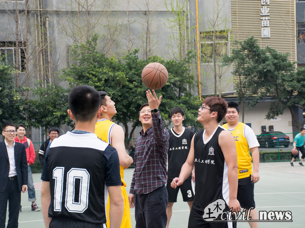 西南交大李锦红书记开球,双方选手都是奋力一跳,最后以西南交大队稍胜一筹,夺得先机。而后,中建三局队也不受此影响,反而率先得分,观众不禁发出一阵的欢呼。中建三局也仿佛受到激励一般,愈战愈勇,连夺好几个上篮,以10:0的大比分领先西南交大。