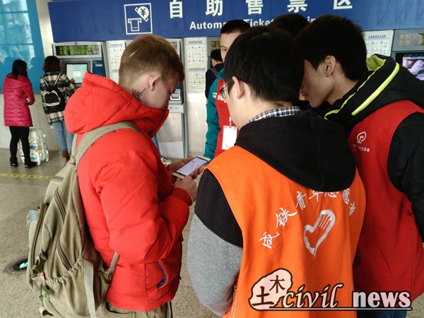 下午的志愿服务也顺利地进行。3:40左右,售票处出现了一位外国友人。由于语言不通,工作人员无法售票。看着其焦急的眼光,志愿者们发挥自己有限的英语水平,全力地帮助其前往甘肃兰州的旅程。虽然结果不尽人意,但也展现了志愿者的态度和热情。经过这次事例,志愿者们也对自身能力提出了更高要求。在17:00左右,志愿活动圆满完成。而后,一位美丽又亲切的工作人员,帮我们拍摄了合影照片,2016年12月03日的土木青协犀浦高铁志愿活动就此结束。