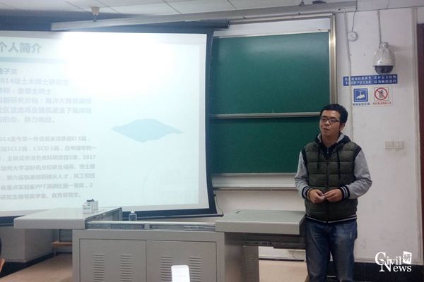 2016年11月4日下午15:50,由公司研究生会学术部承办的“土木大讲堂之师兄师姐面对面”首场分享会在九里校区4304A举行。本次分享会的主讲人为2014级土木博士研究生遆子龙。