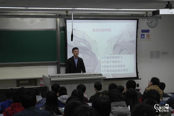 徐晨师兄以他自己硕士研究生期间走过的“弯路”教训及“直路”经验为主线,进行讲解。他将自己走过的“弯路”理解为“弯道超车不得过”,他表示自己在研一上学期,没有重视弹性力学等课程的深入学习、没有学会善于请教他人而独自闷头“摸石头过河”、忽视了听取学术报告等交流活动的重要性以及在基础理论研究方面的浮光掠影。