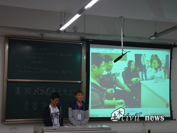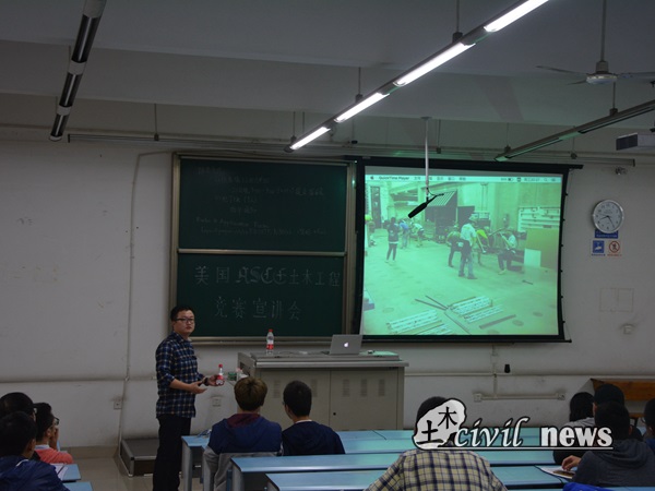 接下来,2016年钢桥队队员张乾、孙朝阳通过图片及视频与同学们分享参赛体会与经验以及竞赛准备过程中的趣闻轶事,并指出对于美国老员工而言ASCE土木工程竞赛更多的是一种享受的过程,希望参加2017年竞赛的同学们也能充分享受其中的乐趣。