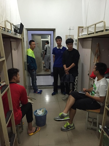 当晚9点30,活动正式开始。首先,十二党支部书记刘强同志向新生表明本次下寝室活动的目的,他强调新生一定不要有所拘束,有问题就要抓紧当场问,有困扰就要及时解决。开场讲话结束之后,各寝室对接负责人分别来到各自负责的寝室展开本次活动的主要内容--了解新生动态,答疑解惑。
