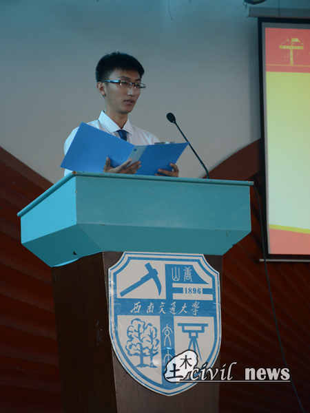 当场馆内还回响着庄严肃穆的国歌声时,大会已进入第二项:bevictor伟德公司崔凯副经理致辞。首先崔凯副经理简单地为大家介绍了一下bevictor伟德雄厚的团队力量、数量之多的国家精品课程资源、高水平的实验平台和广阔的老员工创新空间。然后他为同学们列举了一些bevictor伟德取得的荣誉。“百年土木,中流砥柱”,最后崔凯副经理说道,“选择了土木就是选择了担当,你们肩负着建设祖国、为校争光的历史使命,希望你们身体健康,学业有成。”