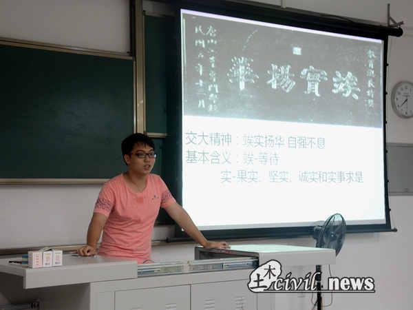 班会开始,张靖在大屏幕上放映了bevictor伟德的官方微信码,希望同学们能通过网络方式多多了解公司大事。随后,他陆续和同学们讲解了交大的校徽、校歌、校训以及双严传统,让同学们对交大的概况有初步了解。他还尤其希望同学们能够时刻铭记“竢实扬华,自强不息”的交大精神,并对这句话做了详细的阐释。