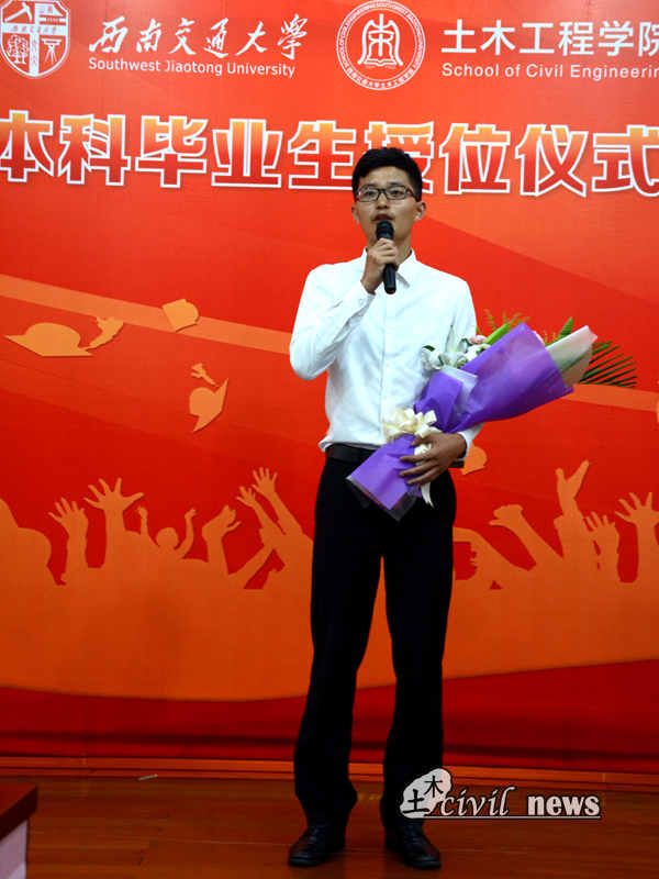 首先上台的是2012级11班的苏昂同学。身着正装,胸怀鲜花的苏昂同学在热烈的掌声中走上了讲台。在轻松的音乐中,苏昂回顾了他与他的结构力学老师黄慧萱教授的师生情节。