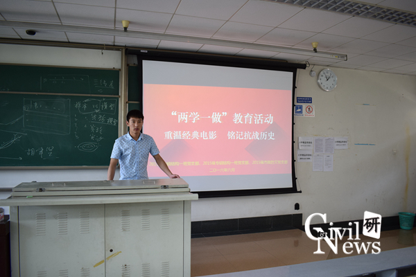 活动刚开始,学硕结构1班党支部书记张桂斌宣读了此次活动目的和流程,他表示“历史是最好的教科书,也是最好的清醒剂,为了深切缅怀抗日英雄的丰功伟绩,弘扬爱国主义和民族精神,铭记中华民族遭受的苦难和抗争的历程,珍惜今天来之不易的和平生活,党支部将进行重温历史,勿忘历史的观影教育活动。”