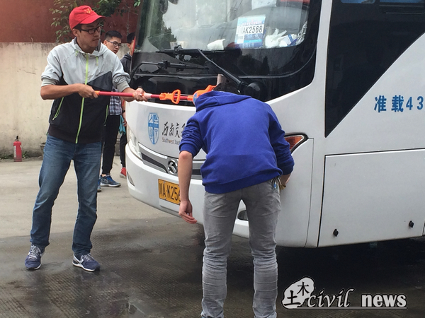 如果校车灰尘更多的话,上述的步骤还有再重复一遍。志愿者们分工有序,玻璃、车身、车内、倒水各司其职,工作起来相当的有效率,洗车师傅开始在旁边给我们指导,看到我们自己完成洗车后赞不绝口。忙碌的工作一直持续到下午4:30,在九里金工实习的机械公司同学们也陆续返校,看到自己乘坐的校车是我们刚刚清洗的,对此也表现了赞赏之情。看着一辆辆“风尘仆仆”的校车在自己的劳动下变的焕然一新,大家心里都是满满的自豪与高兴。本次活动共清洗了3辆校车,在活动的尾声,我们在新洗干净的车前合影留念,司机师傅特许我们的志愿者提前上车,坐在自己亲手清洗里的校车中回到犀浦,洋溢的幸福是难以用文字表达的。