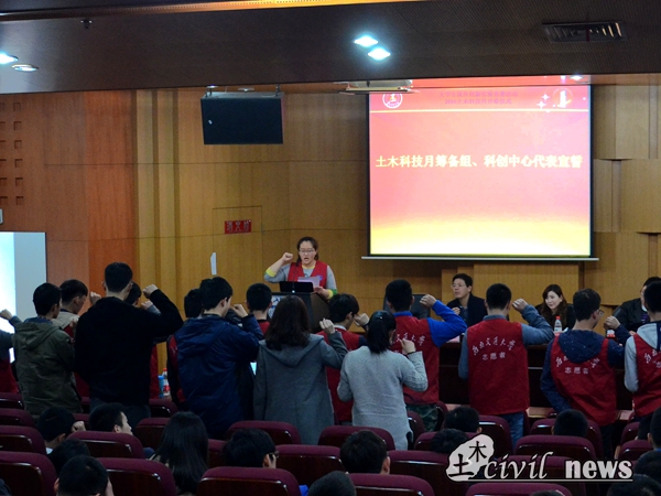 紧接着,李书记正式开始讲解本年底土木科技月活动内容,本次活动包括第六届研究生结构设计大赛、第十六届本科生结构设计大赛、“土木讲坛”专题学术报告会以及第一届BIM校园建筑信息模型竞赛。随后,李书记对本次比赛的时间、进程等进行了介绍。李书记针对为什么要参加土木科技月这个问题,给出了曾经参加过土木科技月的同学的感想:如你曾无心停驻,也可能发现不停捆扎水瓶的守护者用流血的双手一滴滴浇灌着花朵,红染红了红。最后李锦红书记满腹热忱的喊出了他的心语:“期待你的加入,期待你的精彩。”